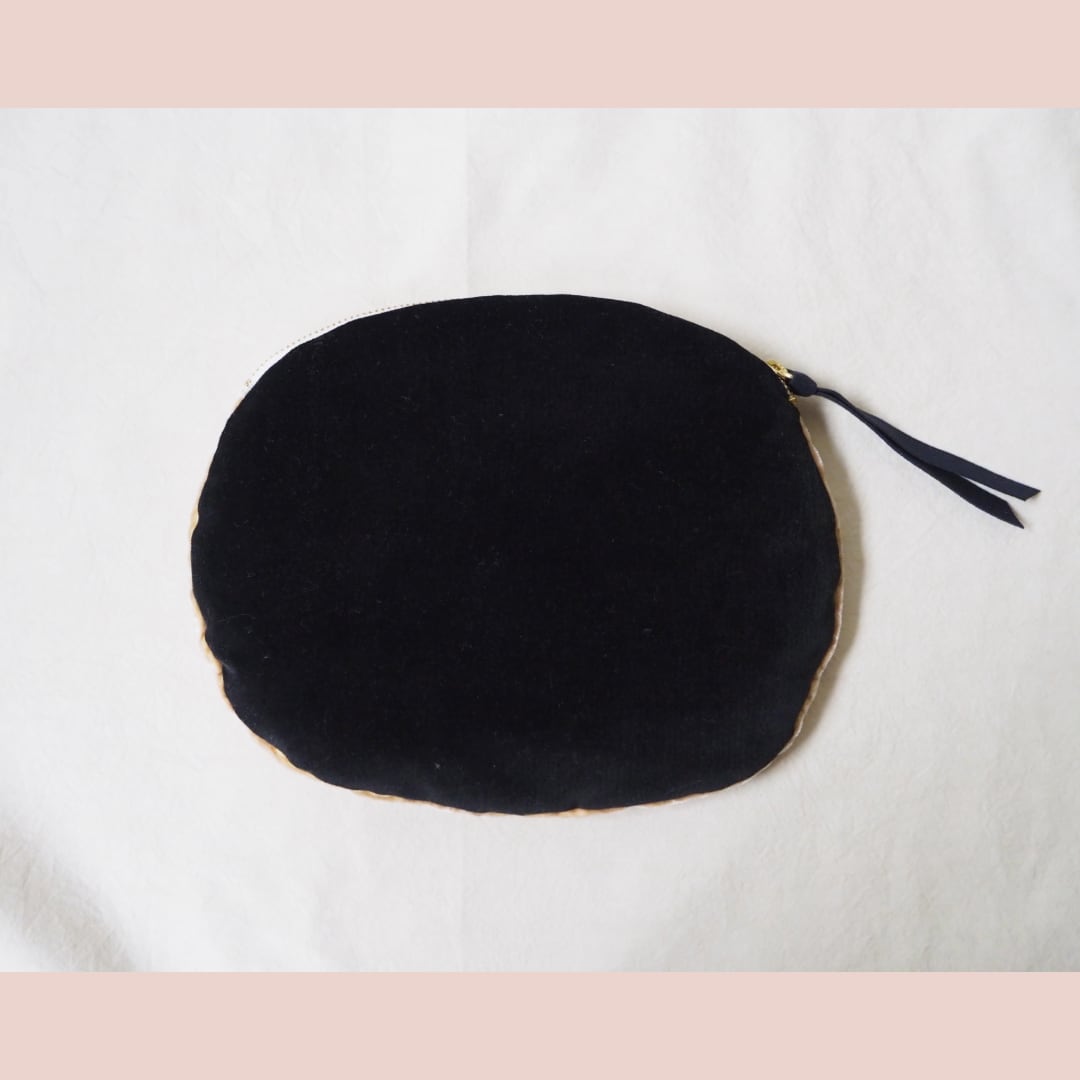 表面は繊細なシルクオーガンジーに刺繍を施し、裏側は高級感を感じる黒の別珍を使用しました。パイピングにも別珍を使用していますので、表側からもその光沢やふんわりした手触りをお楽しみ頂けます。