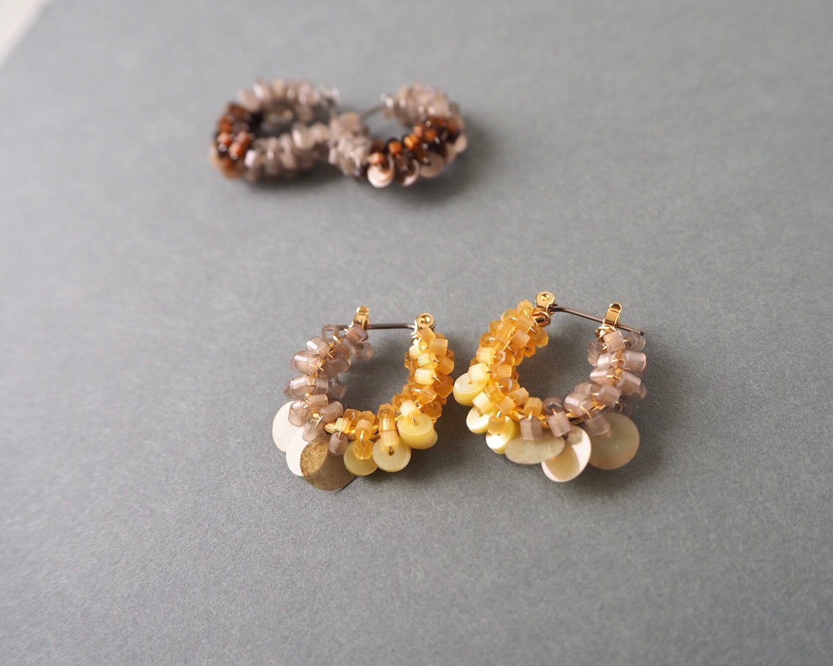 透け感のあるアンティークビーズに光沢が特徴的なビーズ・スパングルを合わせたピアスです。